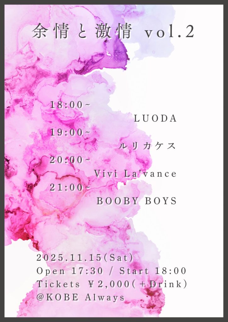 18:00〜LUODA19:00〜ルリカケス20:00〜Vivi La’vance(名古屋)21:00〜BOOBY BOYS